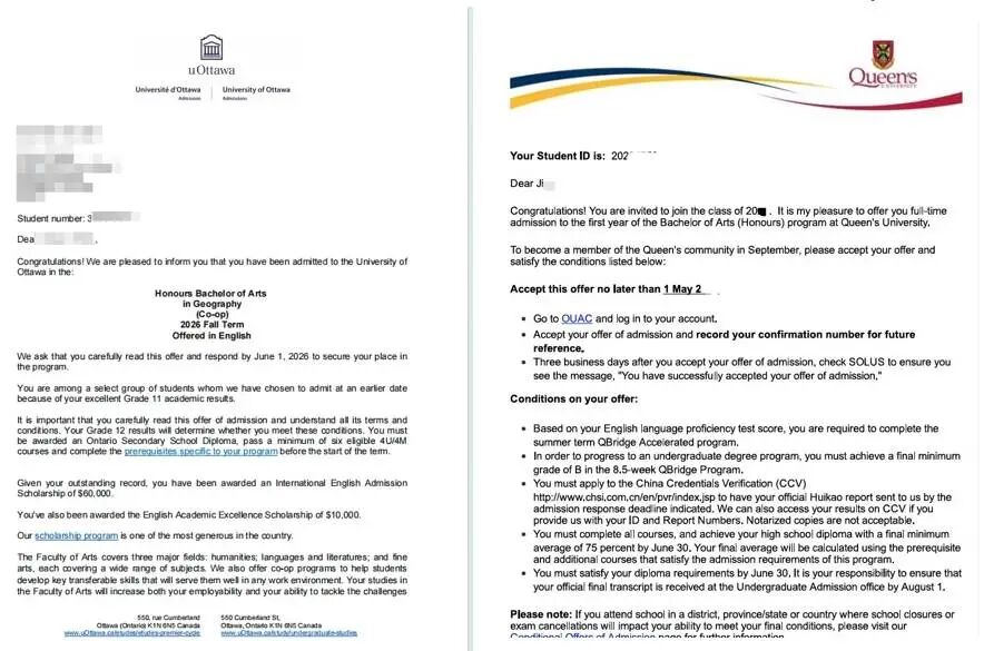 准备了语言、文书,未提交高考成绩申请到世界名 校,最终录取到加拿大皇后大学/渥太华大学等医博类TOP10名 校。