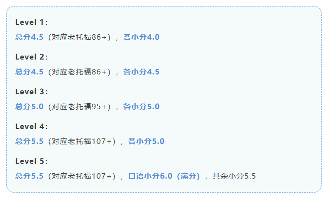 参加的新托福考试,每个Level对应的托福总分与单项要求如下: